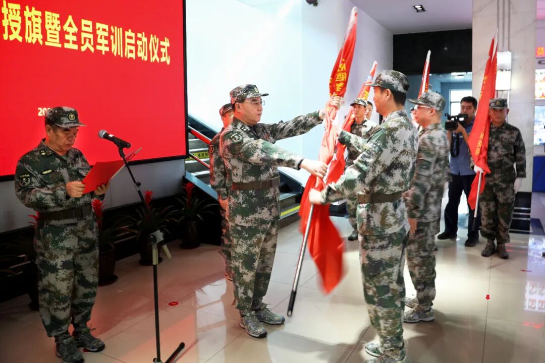 各二级单位党委书记、政工科长、生产科长参加授旗仪式。党群工作部、综合服务中心分别宣读了《民兵管理工作方案》《全员军训方案》。